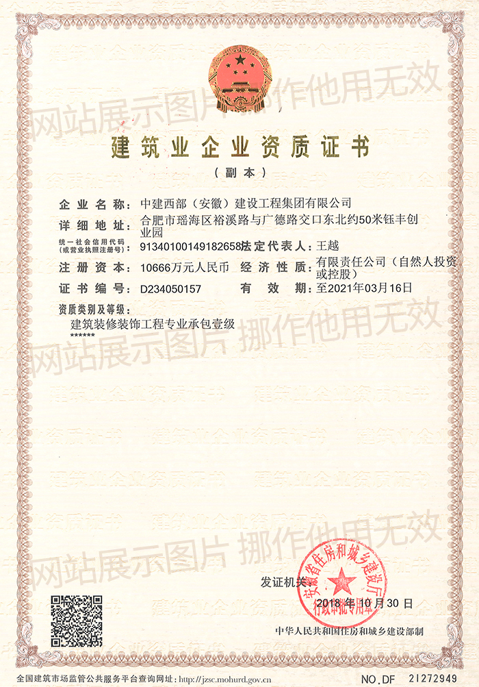 2018年10月,开云·体育顺利地通过了开云(中国)企业资质的审查,是公司继开云(中国)施工总承包壹级、市政公用工程施工总承包叁级资质之后,取得了建筑装修装饰工程专业承包壹级资质。