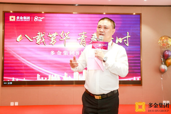 随后,集团董事长刘潍彬先生上台致辞,回顾了多金集团一路走来的发展历程,他说道,多金集团取得今天的成绩离不开每一位多金员工的辛勤付出,以及在背后默默支持的家人们,刘董对他们表示感谢,并指出多金集团在未来的日子里,一定会不畏困难,不辜负社会各界的信任与支持,将多金打造成为一个有社会责任感的优秀企业。