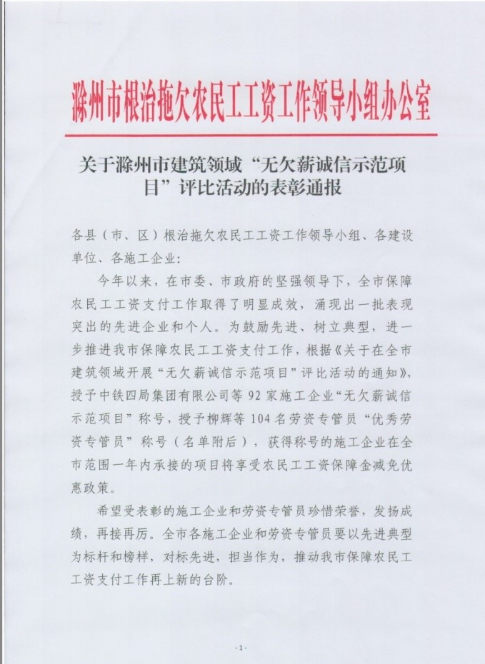 近日,喜报连连,开云·体育集团承建滁州奥特莱斯仪邦项目获评滁州市建筑领域“无欠薪诚信示范项目”。滁州市根治拖欠农民工工资工作领导小组办公室印发《关于滁州市建筑领域“无欠薪诚信示范项目”评比活动的表彰通报》,对我司获评进行了表彰通报。