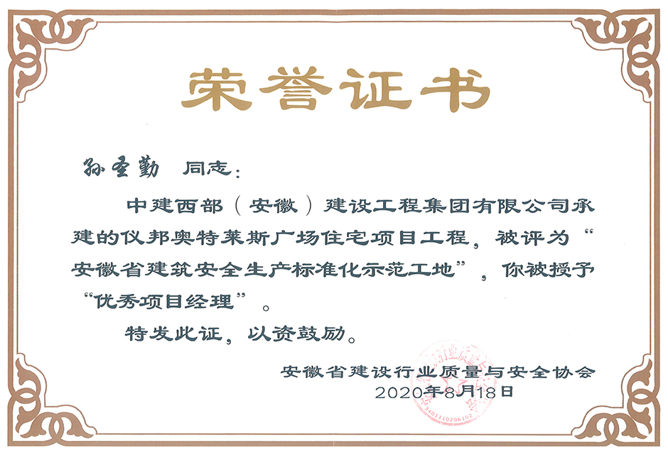 近日,喜报连连,开云·体育建设集团滁州仪邦奥特莱斯广场住宅项目同时荣获安徽省建设行业质量与安全协会、滁州市住房和城乡建设局颁发的“安徽省建筑安全生产标准化示范工地”与“滁州市建筑施工安全质量标准化示范工地”称号。项目经理孙圣勤同志被授予“优秀项目经理”。