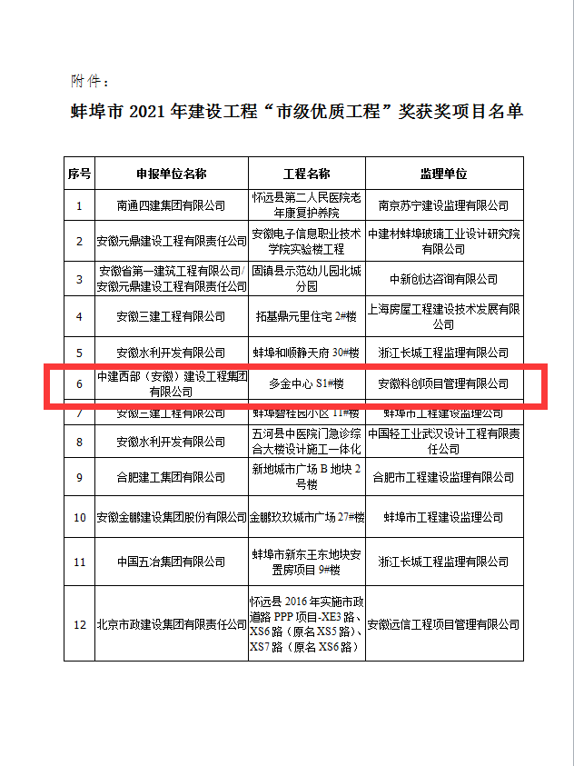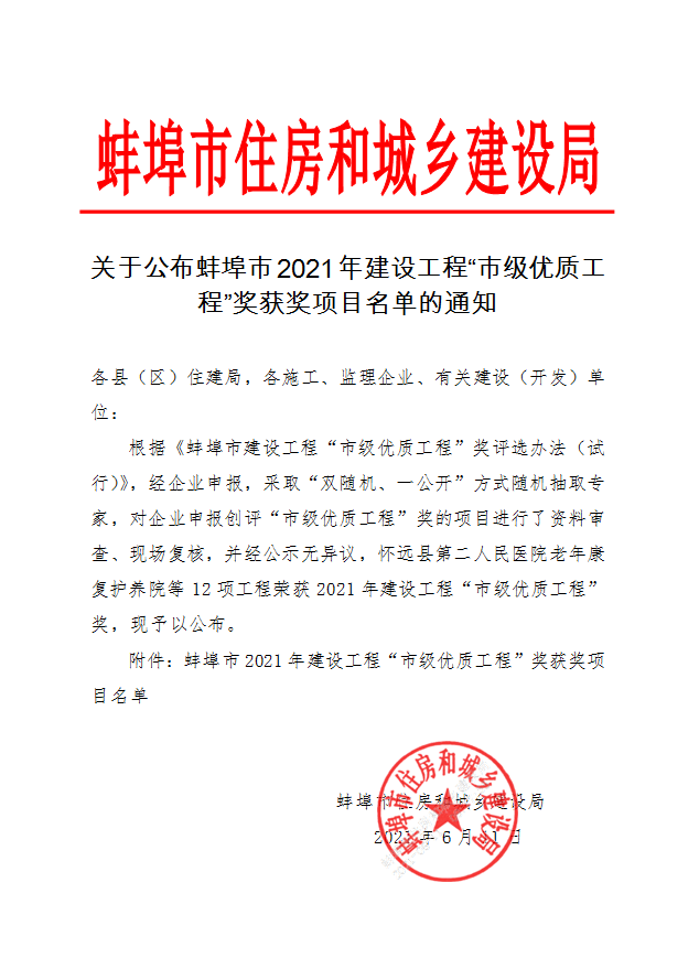 近日,从蚌埠市住房和城乡建设局传来喜讯,由开云·体育承建的,固镇多金中心S1#楼荣获蚌埠市2021年建设工程“市级优质工程”奖。