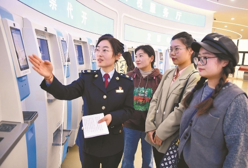 3月31日,在亳州市智慧办税服务厅,工作人员在向纳税人介绍发票代开终端和综合终端事项一键办理业务。本报通讯员 刘勤利 张亚坤 摄