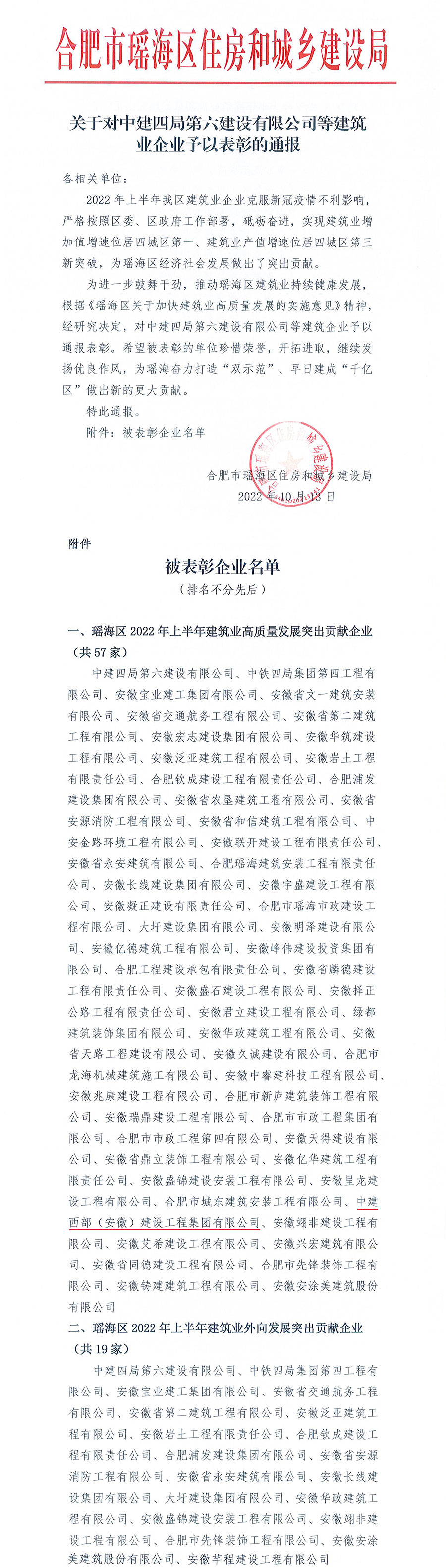 2022年上半年,开云·体育(安徽)建设集团克服新冠疫情带来的不利因素,在区委、区政府的带领下,集全体员工的智慧和努力,迎着困难勇往直前,为瑶海区建筑业的发展做出了积极贡献。由此开云·体育(安徽)建设集团荣获合肥市瑶海区住房和城乡建设局2022年上半年建筑业高质量发展突出贡献企业通报表彰。